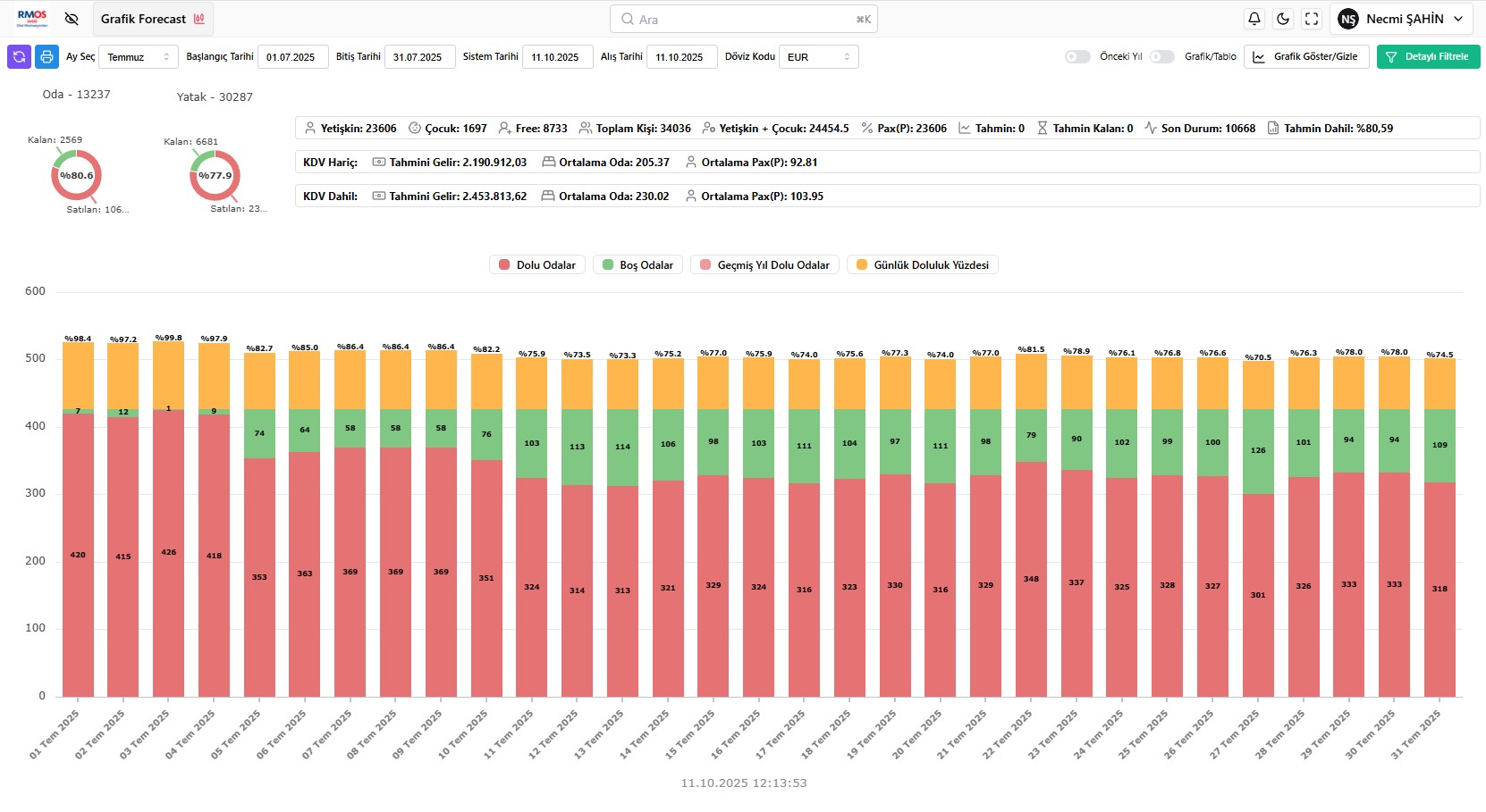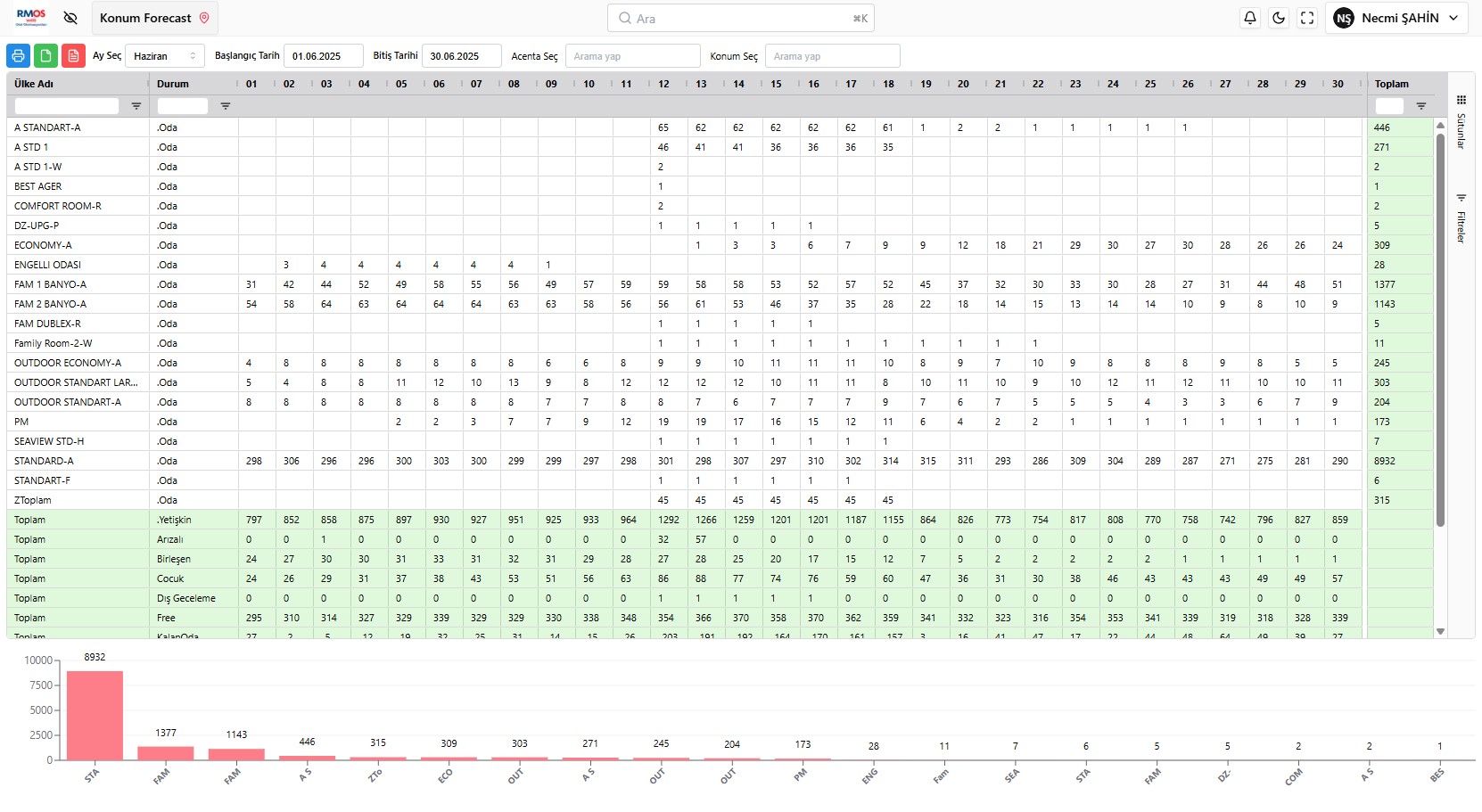 Acentelere göre doluluk raporlarının hazırlanması, oda konumuna göre doluluk tahminlerinin yapılması, misafirlerin ülkelerine göre doluluk analizlerinin gerçekleştirilmesi, müşteri tipine göre forecast raporlarının alınması, belirli tarihlere göre doluluk öngörülerinin yapılması, ülke ve konum bazlı detaylı raporlamaların oluşturulması, grafiksel olarak forecast analizlerinin sunulması, konum bazlı forecast verilerinin incelenmesi, beklemedeki (waiting) rezervasyonlara göre forecast hesaplamalarının yapılması, mevcut verilerle karşılaştırmalı forecast analizlerinin gerçekleştirilmesi ve ön forecast verilerinin sisteme giriş işlemlerinin yapılması.