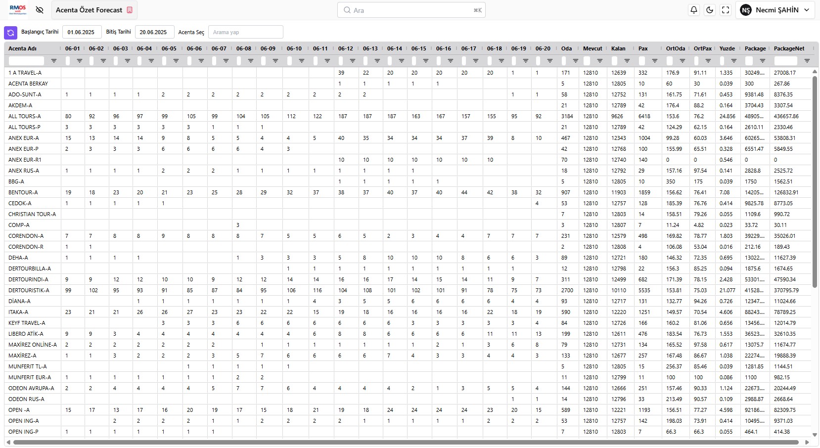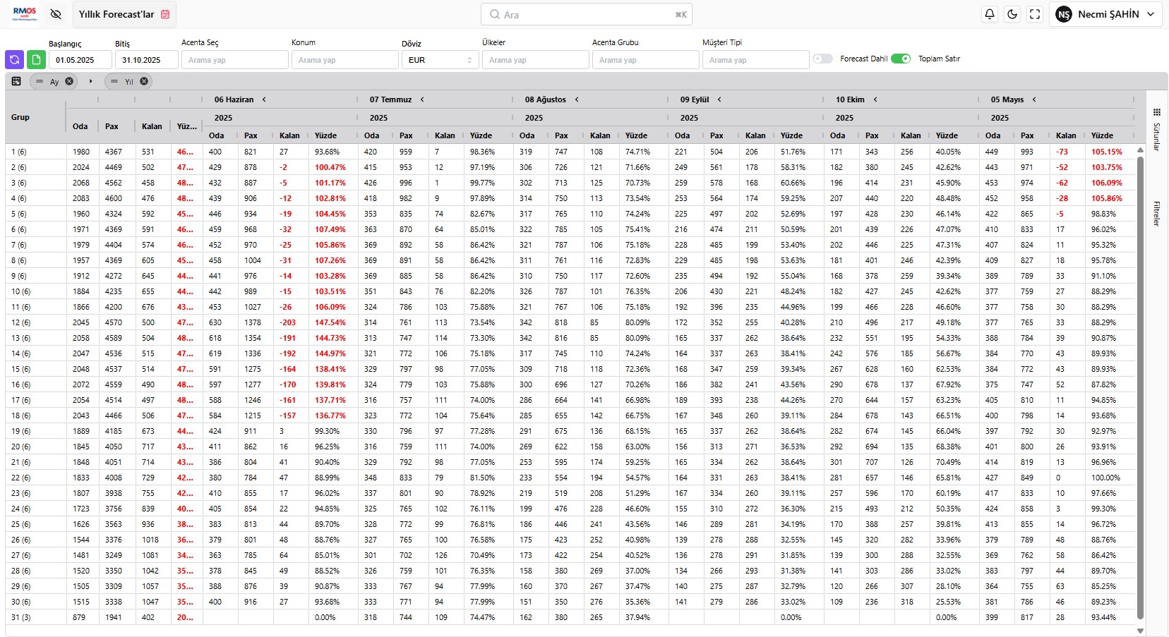 Acentalara göre forecast verilerinin hazırlanması, ön rezervasyonların takibi, kontenjan yönetimi, beklemede (waiting) olan rezervasyonların yönetilmesi, farklı forecast verilerinin birleştirilmesi, sleepout (kalınmayan rezervasyonlar) durumlarının takibi ve müşteri tipi, ülke bilgisi ile net doluluk oranlarının analiz edilmesi.