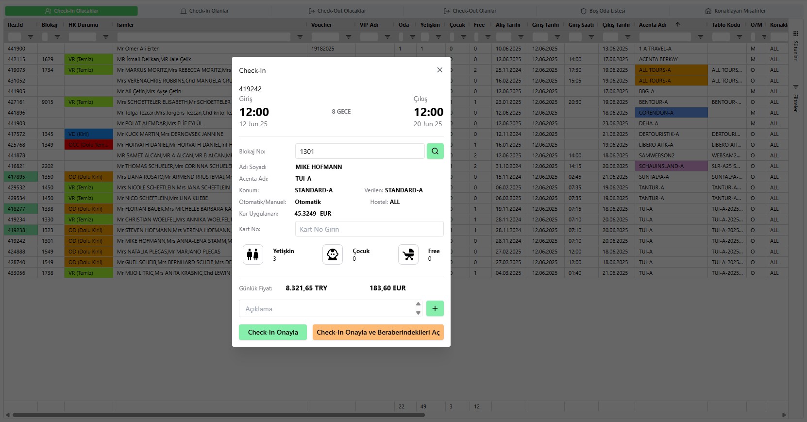 Check-in yapmış misafirlerin listesi, check-in yapacak misafirlerin durumu, odaların konuma göre dağılımı ve forecast (doluluk tahmini) ile gerçek durumun karşılaştırılması.Online check-in işlemleri