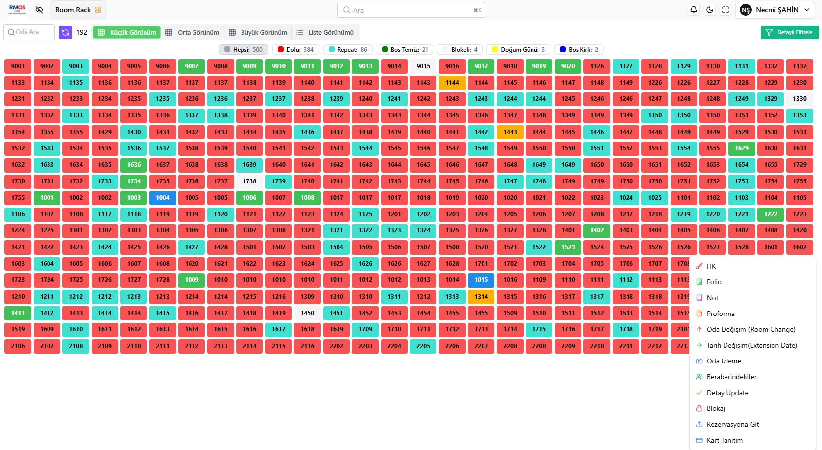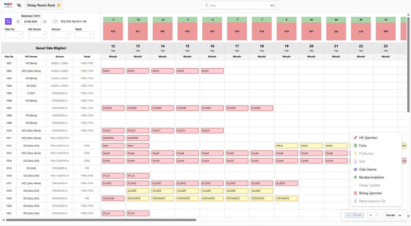 Rack oda durum tablosu bölümünde, tüm odalar tek ekranda gösterilir. Bu ekran üzerinden boş, dolu, arızalı, kirli, blokeli odalar, bugün çıkış yapacak odalar, gelecek odalar ve net doluluk gibi bilgiler farklı renklerle görselleştirilir. Ayrıca aynı ekranda mesaj girme ve okuma, oda hesabı yönetimi, arıza fişi girişi ve tarih değiştirme, oda değişimi, telefon dış hat açma ve kapama işlemleri ile not alma gibi oda izleme işlemleri gerçekleştirilir. Tüm bu işlemler rack bölümünde yapılmaktadır.