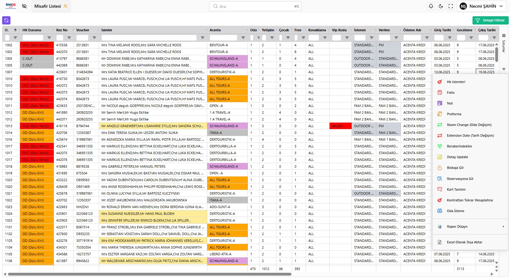 İnhouse (şu anda otelde bulunan) müşteriler, geçmiş (history) müşteri kayıtları, normal müşteri listeleri, oda, folio, isim, soyadı, acente ve tarihe göre sıralanmış listeler, beraberindeki kişilerin ve yapılan değişikliklerin takibi, arama işlemleri (konum, acente, isim-soyadı, ödeme durumu, grup, pansiyon tipi, ülke gibi kriterlere göre), resmi müşteri listeleri, polis defteri kayıtları ve otomatik polis bildirim gönderimi, özel tarihli (special date) inhouse müşteriler, oda değişiklikleri ve chart işlemleri.