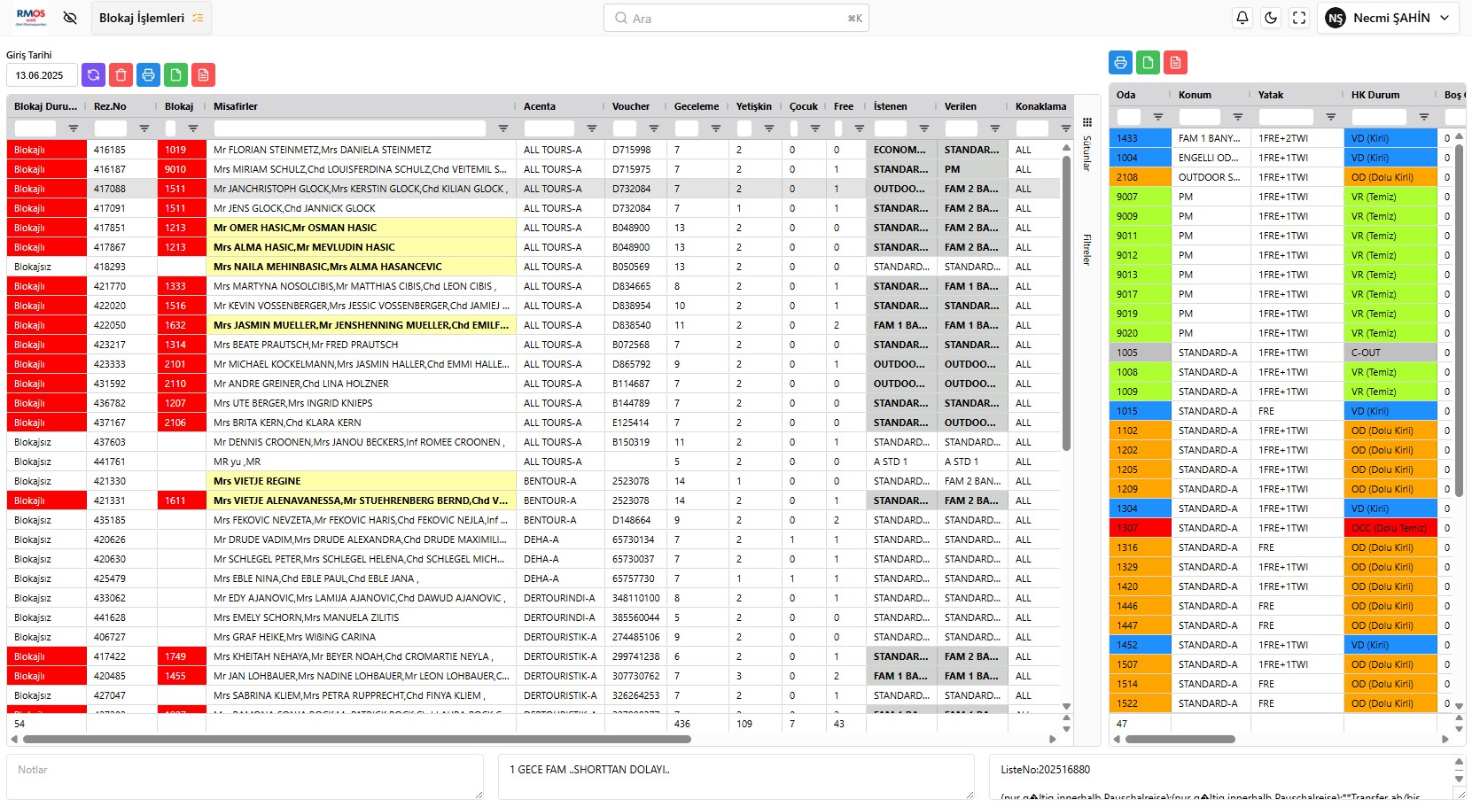 Fiş numarası, oda numarası ve acente bazında sıralı blokaj takibi, blokajların tablo üzerinden kontrol edilmesi, otomatik blokaj uygulamaları ve oda izleme işlemleri, ayrıca tek konum ve tek kat bazında blokaj yönetimi.